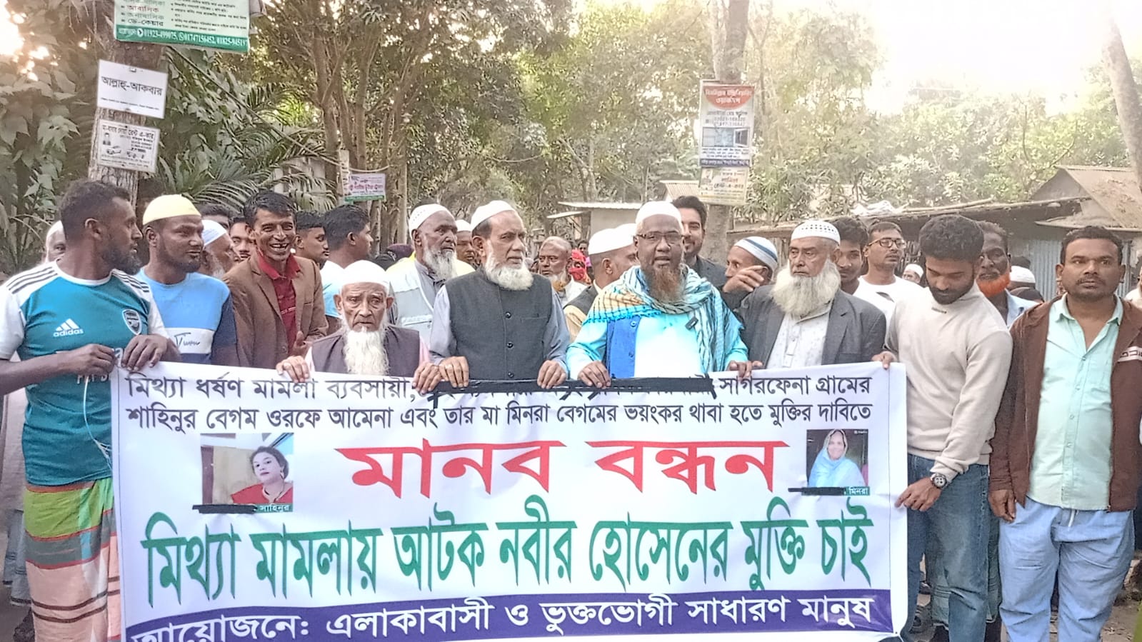 মানববন্ধনে মিথ্যা মামলায় আটক নবীর হোসেনের মুক্তির দাবি তুলে ধরে শুক্রবার বিকেলে উপজেলার জগতপুর ইউনিয়নের সাগরফেনা গ্রামের মধ্যপাড়ায় এই মানববন্ধন কর্মসূচি পালন করে এলাকাবাসী ও ভুক্তভোগী সাধারণ মানুষ।