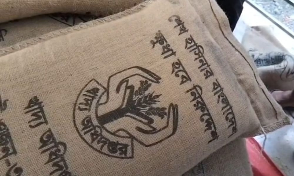 ঈদ উপলক্ষে সরকার থেকে অসহায় পরিবারের জন্য ১০ কেজি করে ভিজিএফের চাল বরাদ্দ দেওয়া হয়েছে। বিতরণ কার্যক্রম চলাকালে কয়েকটি বস্তায় ‘শেখ হাসিনার বাংলাদেশ, ক্ষুধা হবে নিরুদ্দেশ’ স্লোগান লেখা দেখতে পান স্থানীয়রা।